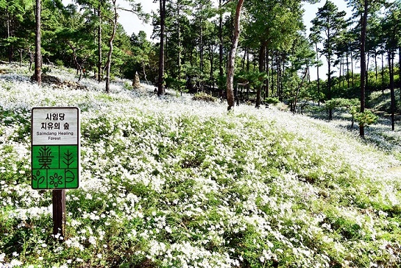 율곡수목원 입구를 지나 소나무가 우거진 ’침엽수림‘에 오르면 구절초 ’치유의 숲‘이 자리잡고 있다.