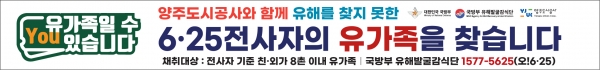 10월 6.25 전사자 유가족 집중찾기의 달을 맞아 공사에서 관리하는 현수막지정게시대를 활용해 6.25 전사자 유가족 찾기 현수막을 게시하는 것으로 10월 한 달간 홍보할 예정이다.