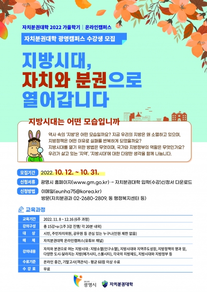 [금요저널] 광명시는 오는 10월 31일까지 ‘지방시대, 자치와 분권으로 열어갑니다’를 주제로 자치분권대학 광명캠퍼스 가을학기 수강생을 모집한다.