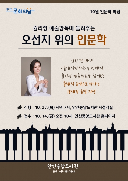 [금요저널] 안산시 중앙도서관은 10월 문화가 있는 날을 맞아 인문학 마당 강연 ‘오선지 위의 인문학’을 선보인다고 13일 밝혔다.