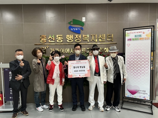 [금요저널] 의정부시 흥선동 행정복지센터는 10월 13일 향수의 벗님들에서 의정부시 100일간 사랑릴레이 배턴 잇기 일환으로 성금 20만원을 기탁했다고 밝혔다.