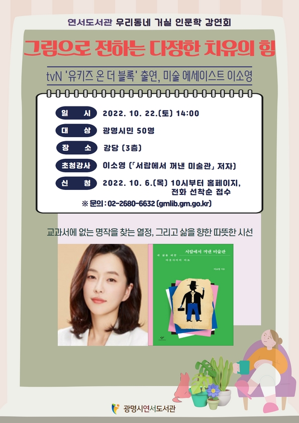 [금요저널] 광명시 연서도서관은 오는 10월 22일 오후 2시 도서관 3층 강당에서 ‘서랍에서 꺼낸 미술관’ 이소영 작가를 초청해 거실 인문학 강연회를 개최한다.