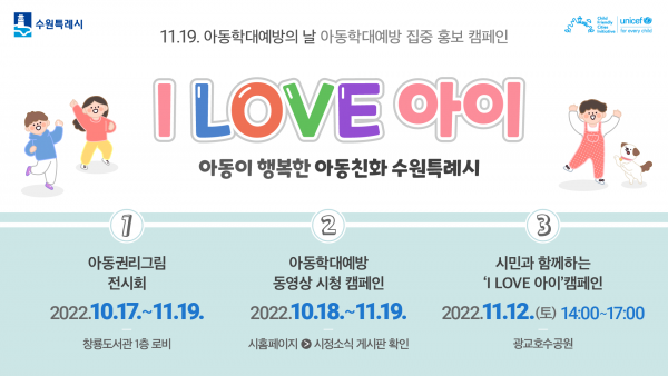 11월 12일 오후 2시에는 광교호수공원에서 시민과 함께하는 ‘I LOVE 아이’ 캠페인을 연다.
