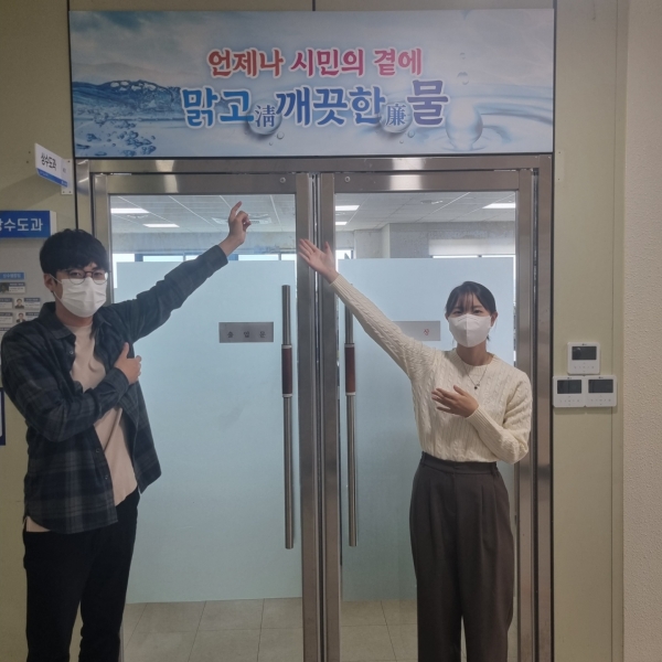 출입문에는 ‘언제나 시민의 곁에 맑고 깨끗한 물’이라는 문구와 ‘청렴’을 한문으로 디자인해 전시했으며 이번 문구의 디자인은 신규 공무원인 김미겸 주무관과 정태균 주무관의 아이디어로 제작됐다.
