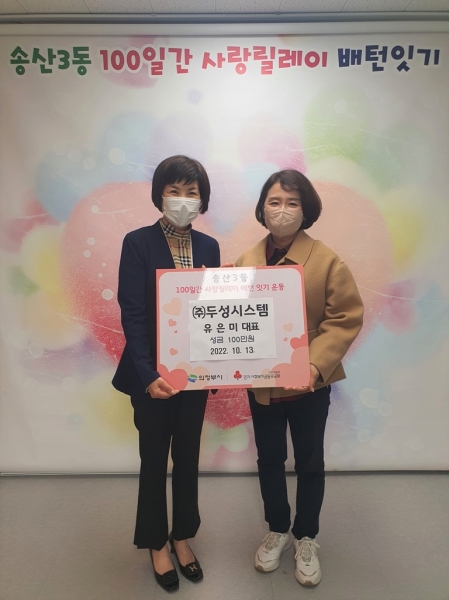 박금숙 송산3동 복지지원과장은 “따뜻한 사랑으로 100일간 사랑릴레이의 시작을 열어주신 유은미 ㈜두성시스템 대표님과 관계자분들께 진심으로 감사드리며 귀하게 보내주신 성금은 지역의 취약계층이 따뜻한 겨울을 맞이할 수 있도록 소중하게 잘 전달하겠다”고 감사의 인사를 밝혔다.