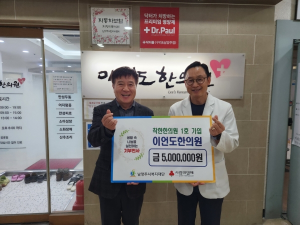 이에 남양주시복지재단 심우만 대표이사는 “이언도 원장님의 선한 영향력이 어려운 이웃들에게 잘 전달될 수 있도록 최선을 다하겠다”고 말했다.