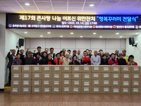 [금요저널] 사회복지법인 대한불교조계종사회복지재단에서 위탁운영하고 있는 미추홀종합사회복지관은 ‘제17회 큰사랑 나눔 어르신 위안잔치 - 행복꾸러미 전달식’을 진행했다.