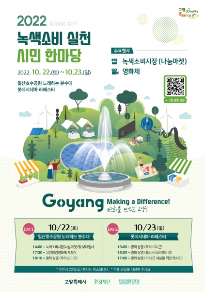 [금요저널] 고양특례시가 10월 22일부터 10월 23일까지 일산호수공원 노래하는 분수대와 라페스타 롯데시네마에서 ‘녹색소비 생활실천 시민한마당'을 개최한다.
