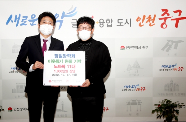 [금요저널] 인천 중구는 지난 17일 정일장학회에서 중구 관내 저소득 초·중·고등학생을 지원하고자 노트북 11대를 기탁했다고 밝혔다.