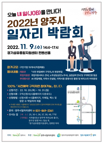 [금요저널] 양주시는 오는 11월 9일 경기섬유종합지원센터 컨벤션홀에서 양주새일센터, 양주고용복지+센터와 함께 공동으로 ‘2022년 양주시 일자리박람회’를 개최한다고 밝혔다.