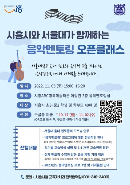 [금요저널] 시흥시는 10월 17일부터 11월 2일까지 관내 예비 초등 4학년에서 중등 3학년 학생 및 학부모 40명을 대상으로 진행하는 시흥시-서울대 교육협력사업 ‘음악멘토링’의 ‘오픈클래스’ 참가자를 모집 중이다.