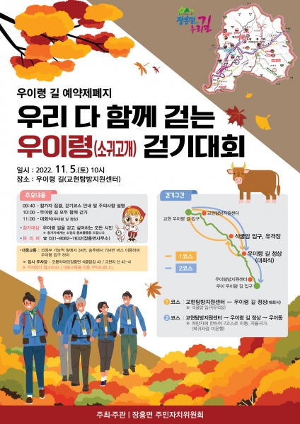 [금요저널] 양주시 장흥면 주민자치위원회는 오는 11월 5일 토요일에 ‘우리 다함께 걷는 우이령 걷기대회’를 개최한다고 밝혔다.