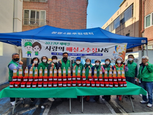 [금요저널] 광명시 광명4동 새마을지도자협의회·부녀회는 지난 18일 ‘2022년 사랑의 매실고추장 나눔’ 행사를 열어 직접 담근 고추장과 매실청을 관내 독거노인 등 저소득가정 70가구에 전달했다.