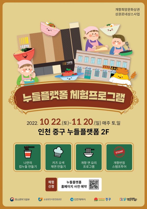 주요 프로그램으로는 다양한 천연 가루를 활용한 ‘키즈 오색 제면 만들기’ 맛과 멋 모두를 참가자들의 취향에 맞춘 ‘나만의 컵누들 만들기’ 인천 중구의 대표 면 요리인 짜장면과 쫄면 밀키트를 만들어 보는 ‘개항 면 요리 만들기’ 가 있다.