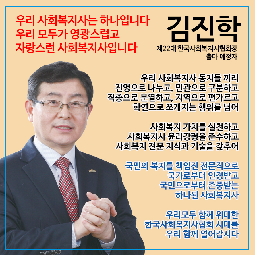 사회복지사 동지들이 더 이상 진영으로 사회복지사를 판단하며 나누고, 민관으로 대립하며, 직종으로 분열하고, 지역으로 나뉘고, 학연으로 쪼개졌던 현실을 이제 뛰어넘어, 사회복지가치로 하나가 되는 사회복지사, 사회복지사협회가 이제는 도래할 때가 되었다.