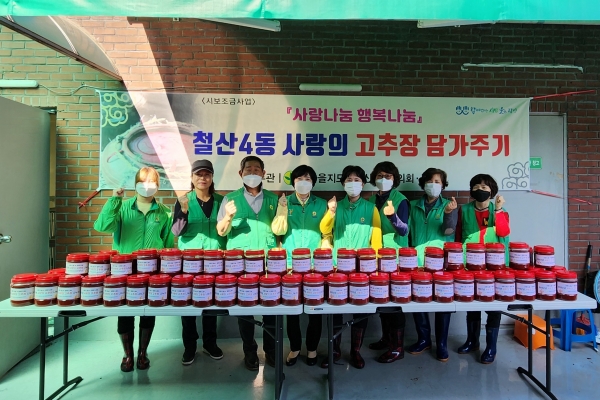 [금요저널] 광명시 철산4동 새마을지도자협의회·부녀회는 지난 20일 ‘2022년 사랑의 고추장 나눔’ 행사를 진행하고 관내 한부모가정 등 소외계층 60가구에 직접 담근 고추장을 전달하며 따뜻한 이웃의 정을 나눴다.