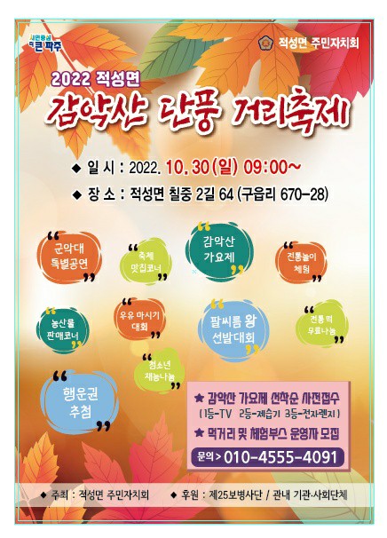 [금요저널] 파주시 적성면 주민자치회는 오는 30일 적성 전통시장 칠중2길 64 일원에서 ‘2022 적성면 단풍거리 축제’를 개최한다.