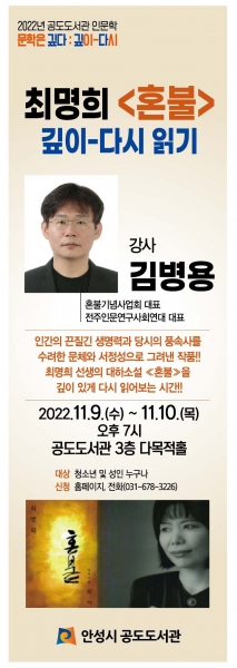 이번 강연은 올해 공도도서관에서 진행하는 인문독서프로그램의 마지막 주제로 오래도록 사랑받은 작가 박완서 김수영, 박경리에 이어 이번 강연에서는 바위에 손가락으로 글을 썼다는 작가 최명희를 집중조명하고 더불어 ‘혼불’의 서사 질서와 문학사적 의미를 살펴볼 예정이다.