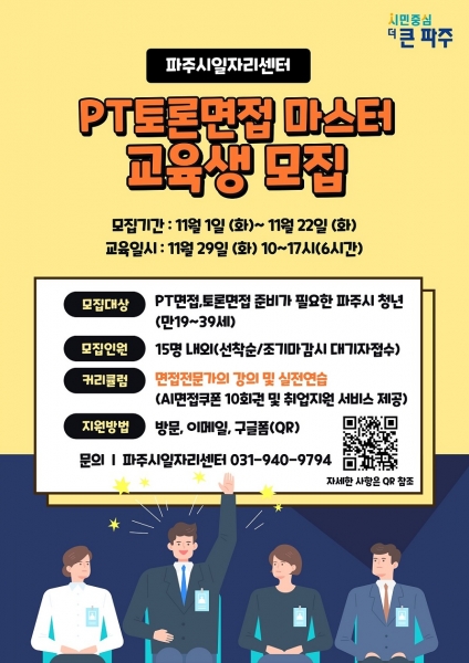[금요저널] 파주시는 11월 1일부터 22일까지 ’PT·토론 면접 마스터 프로그램‘의 참여자 15명을 선착순으로 모집한다.