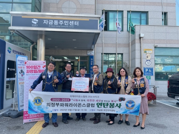 [금요저널] 의정부시 자금동은 10월 21일 의정부파워라이온스클럽이 자금동에 거주하는 난방취약계층에게 연탄 2,000장을 기탁해 ‘2022년 100일간 사랑릴레이’ 첫 발걸음을 시작했다고 밝혔다.