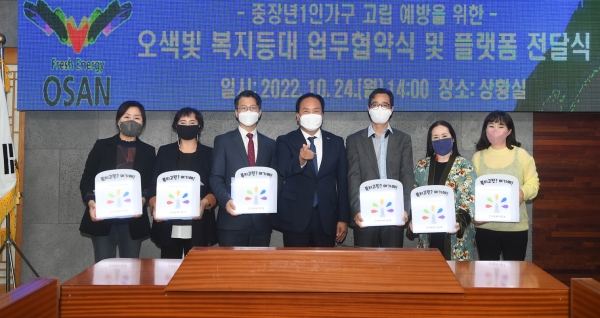 [금요저널] 오산시는 지난 24일 궐동 원룸 밀집 지역 중장년 1인 가구 등 위기가구 고립 예방을 위한 민·관 복지거점을 기반한 주민 주도 관계망 형성사업인 “오색빛 복지등대”업무협약 및 플랫폼 전달식을 개최했다고 밝혔다.