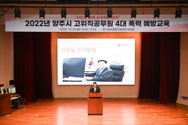 [금요저널] 양주시는 지난 24일 경기섬유종합지원센터에서 강수현 시장을 비롯한 5급 이상 간부공무원 60여명을 대상으로 4대 폭력 예방교육을 진행했다고 밝혔다.