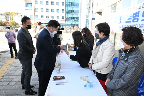 이날 강수현 시장은 페트병 재활용 회수 자판기 운영현황 등에 대한 보고를 받고 자판기에 직접 투명페트병을 투입한 뒤 포인트가 적립되는 것을 확인하며 기계 이용방법에 대해 익혔다.