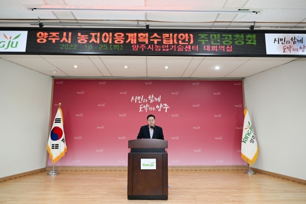 이번 공청회는 쾌적한 농촌환경 보전과 효율적인 농지이용 도모를 위한 양주시 농지이용계획수립에 대해 지역주민 및 관계 전문가 등으로부터 다양한 의견을 수렴하기 위해 마련했다.