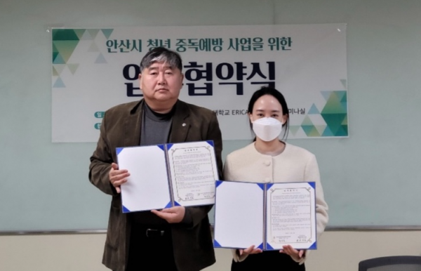 [금요저널] 안산시 중독관리통합지원센터는 지난 25일 한약대학교 ERICA 사회봉사단과 관내 청년층 중독예방과 지원을 위한 업무협약을 체결했다고 26일 밝혔다.