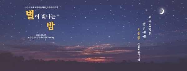 [금요저널] 안산시는 오는 11월 4일 안산문화예술의전당 달맞이극장에서 안산시 보육교직원 600명을 대상으로 보육교직원 힐링문화공연 ‘별이 빛나는 밤’ 행사를 개최한다고 27일 밝혔다.