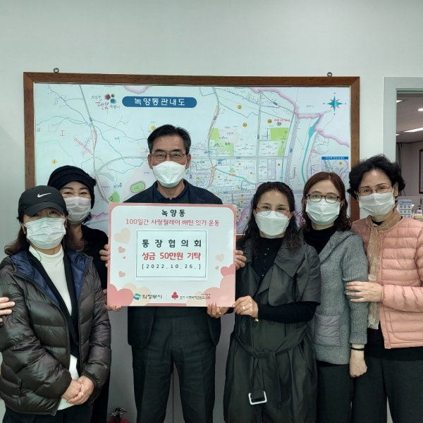 [금요저널] 의정부시 녹양동 통장협의회는 10월 26일 녹양동 주민센터를 방문해 성금 50만원을 기탁하며 범시민 이웃사랑 나눔 캠페인인‘100일간 사랑릴레이 배턴 잇기 운동’을 이어갔다.