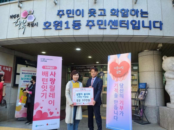 [금요저널] 의정부시 호원1동은 25일 호원1동 소재 심청이 주간보호센터 봉사회에서 100일간 사랑릴레이 배턴 잇기 운동에 동참하고자 성금 30만원을 기부했다고 밝혔다.