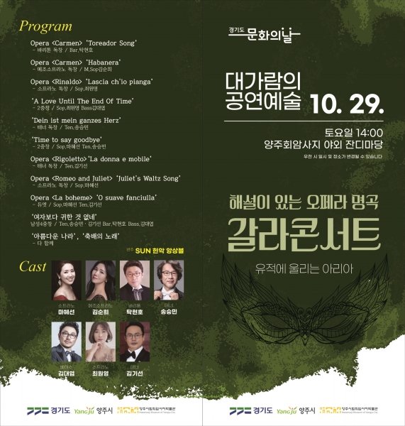 이번 공연은 경기도 문화의 날 문화예술프로그램의 일환으로 1회차 재즈공연, 2회차 오케스트라 공연에 이어 올해 초 유네스코 세계유산 잠정목록으로 등재된 ‘양주 회암사지’ 앞 잔디마당에서 오페라를 주제로 펼쳐진다.