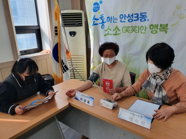 [금요저널] 안성시 안성3동은 특수시책의 일환으로 지난 26일 지역주민의 자기 건강관리 능력을 향상시키고자 기관사회단체 회원을 대상으로 혈압을 체크해주는 시간을 마련했다.