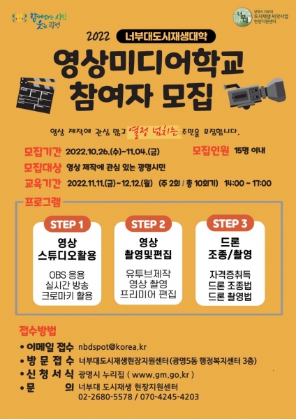 [금요저널] 광명시는 오는 11월 11일부터 12월 12일까지 진행하는 ‘2022 너부대 도시재생 영상미디어학교’ 참여자를 모집한다.