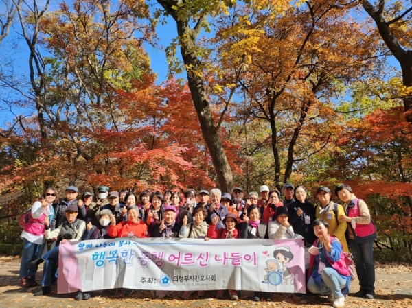 코로나19로 외부 활동이 어려웠던 어르신들은 의정부시간호사회 간호사 10명과 동행해 광릉수목원의 아름다운 단풍을 둘러보고 웃음치료 레크리에이션에 참여하며 행복한 추억을 만들었다.