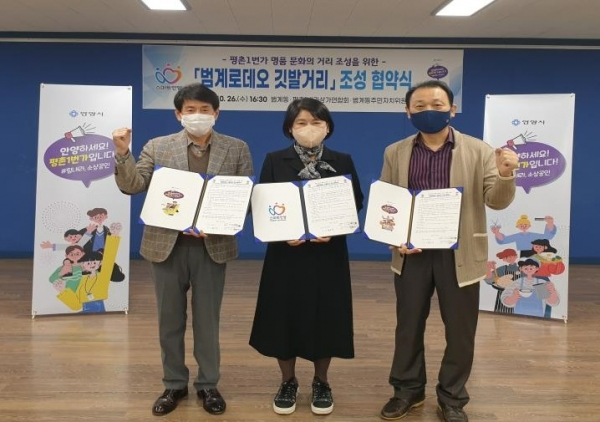 [금요저널] 안양시 범계동 행정복지센터와 범계동 주민자치위원회, 평촌1번가 상가연합회는 26일 동 청사에서 평촌1번가 명품 문화의 거리 조성을 위한 ‘범계 로데오 깃발거리 조성’ 협약식을 맺었다.