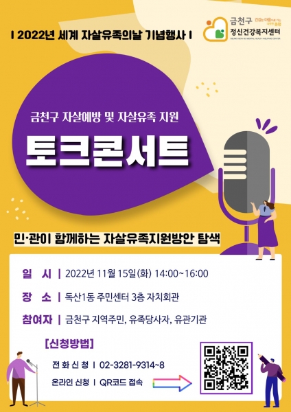 [금요저널] 금천구는 금천구정신건강복지센터에서 11월 15일 오후 2시 독산1동 주민센터 3층에서 ‘자살 예방 및 자살 유족지원 토크 콘서트’를 개최한다.