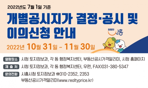 [금요저널] 시흥시는 2022년 7월 1일 기준 개별공시지가에 대해 10월 31일자로 결정·공시하고 10월 31일부터 11월 30일까지 토지소유자와 이해관계인 등의 이의신청을 받는다.