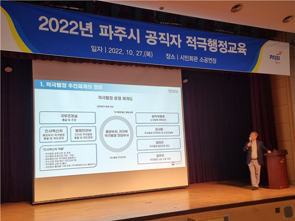 [금요저널] 파주시는 27일 시민회관 소공연장에서 적극행정 교육을 실시했다.