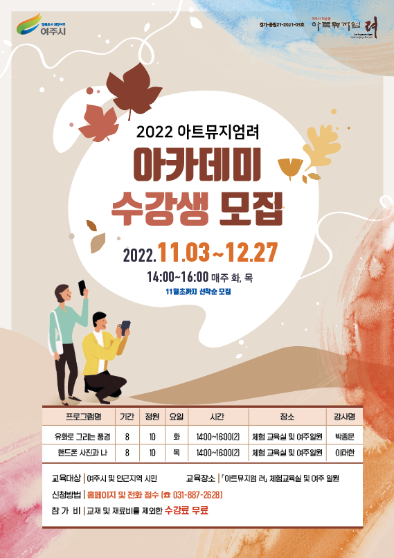 [금요저널] 여주시 미술관 ‘아트뮤지엄 려’는 2022년 11월 3일부터 12월 27일 기간 아트뮤지엄 려 아카데미 프로그램을 운영하고 수강생을 모집한다.