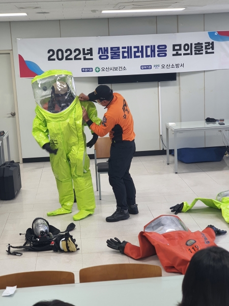오산소방서 현장대응단의 협조로 개인보호구 착·탈의 시연 및 실습, 다중 탐지 키트 시행 등 현장 대응에 효과적으로 적용할 수 있는 실습형 훈련으로 진행됐다.