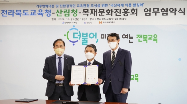 [금요저널] 산림청은 전라북도교육청, 목재문화진흥회와 10. 31. 전라북도 교육청에서 ‘학교 목재 이용 활성화를 위한 업무협약’을 체결했다고 밝혔다.