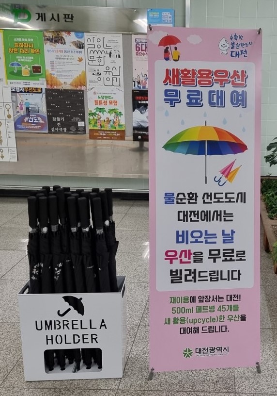 [금요저널] 대전시는 물순환선도도시 홍보를 위해 11월 1일부터 22개 지하철 역에서 우산 무료 대여 서비스를 시행한다고 밝혔다.
