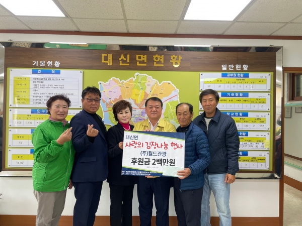 [금요저널] 여주시 대신면은 11월 1일 대신면 행정복지센터에서 ㈜월드관광 대표 이춘옥으로부터 사랑의 김장나눔 행사비용 200만원을 기탁받았다.
