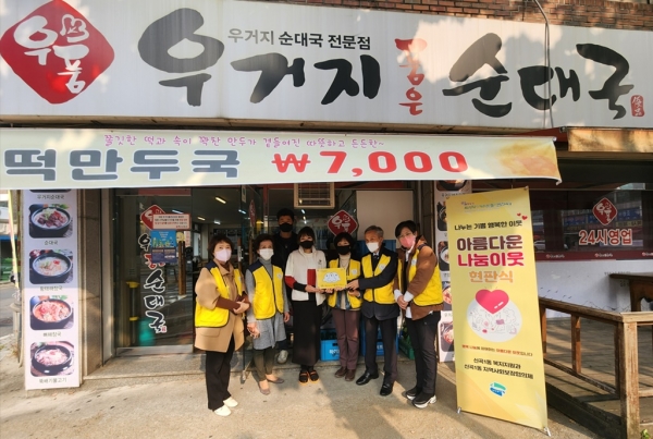 이번 26호 나눔 이웃으로 선정된 곳은 신곡동에 위치한 우거지 품은 순대국 본점으로 2018년 12월에 신곡1동 복지지원과와 복지자원 나눔 협약을 체결해 지역사회를 위한 나눔 활동에 꾸준히 동참하고자 매월 순댓국 20인분을 기탁해 오고 있다.