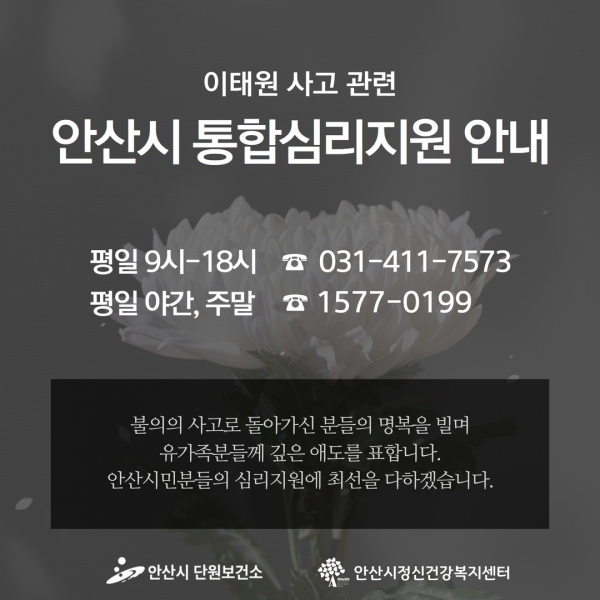 이민근 시장은“갑작스러운 사고에 깊은 애도를 표하며 이번 사고로 심리적 어려움을 겪는 시민들이 심리상담을 통해 원활히 일상으로 복귀하는데 도움이 되길 바란다”고 말했다.