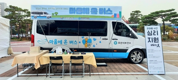 [금요저널] 오산시는 11월 3일부터 5일까지 오산시 합동분향소에‘마음안심버스’를 배치해 이태원 사고로 불안감과 우울감을 느끼는 시민들에게 심리안정을 위한 심리지원 서비스를 제공한다고 밝혔다.