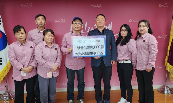 김승근 양주1동장은 “어려운 시기로 모두가 힘든 상황에서도 매년 소중한 사회공헌을 실천해주신 ㈜굿데이크리닝서비스에 진심 어린 감사의 말씀을 드린다”며 “기탁해주신 성금은 투명하고 공정하게 배분해 어려운 이웃들에게 잘 전달될 것이다”고 말했다.