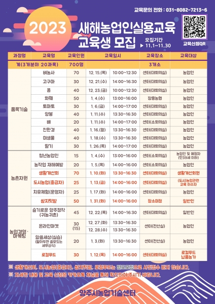 신청방법은 구글폼에 접속해 신청서를 제출하거나 카카오채널‘양주시농업기술센터’에서 ‘2023년 새해농업인실용교육’게시글에 나와 있는 링크 혹은 포스터에 있는 QR코드를 통해 신청하면 된다.